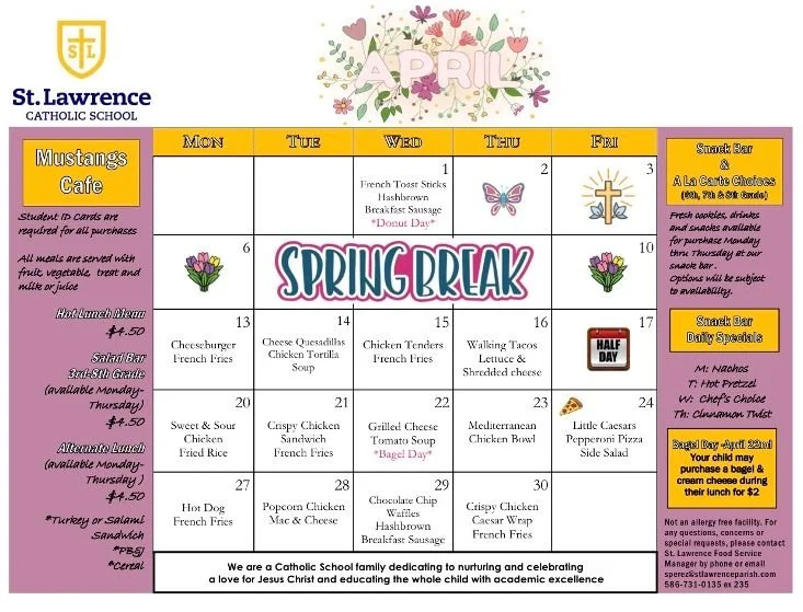 Also, lunch on Thursday, April 23, 2026 will now be Crispy Chicken Sandwich served with French Fries.