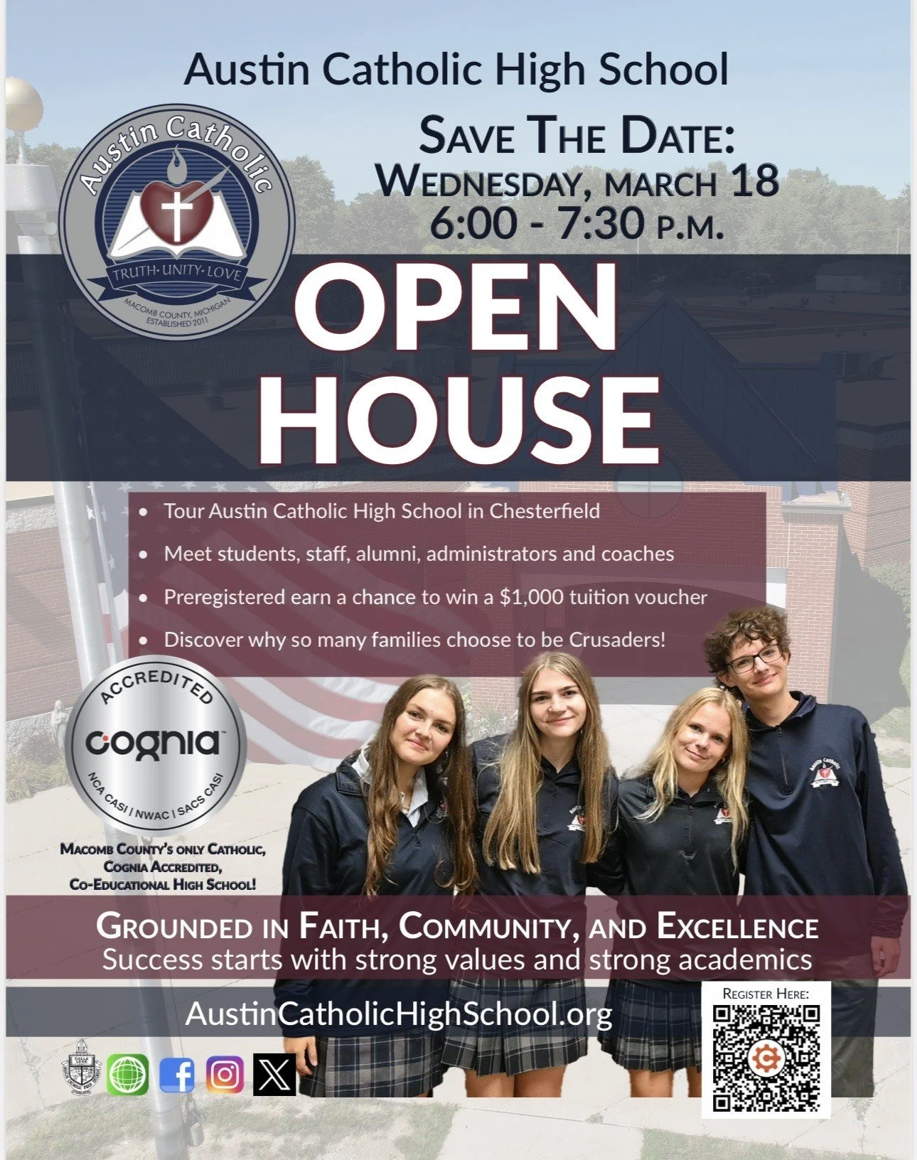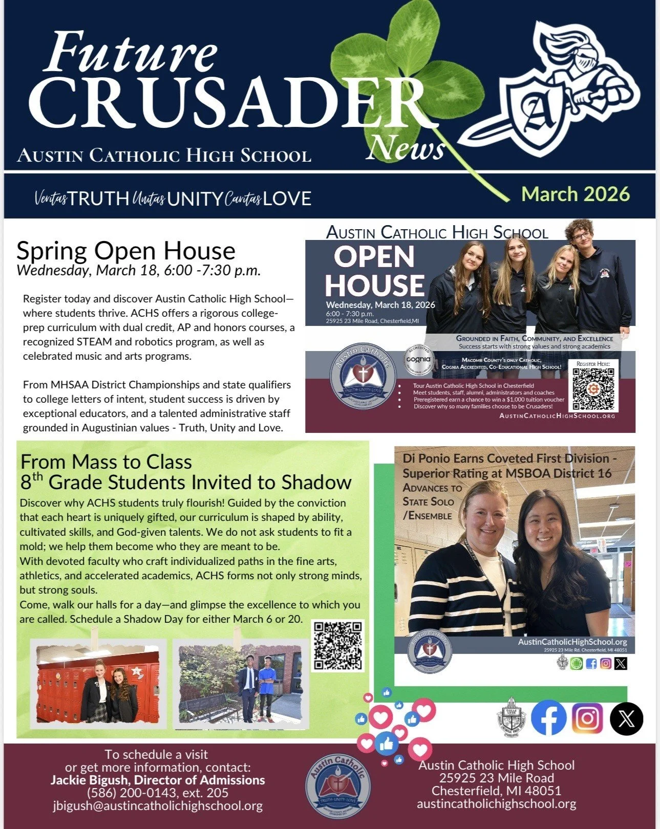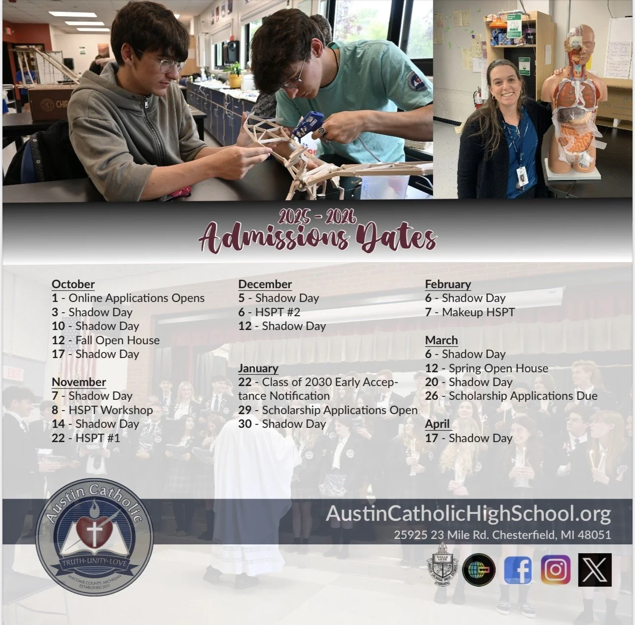 Guided by the Augustinian core values of truth, unity, and love and embedded in a vibrant faith community, Austin Catholic High school is open to young men and women of diverse backgrounds in the tri-county area. Qualified, dynamic and supportive staff unite with students and families to create a safe and supportive environment that embraces individuality and celebrates community. Comprehensive, rigorous curriculum maximizes each students’ potential to inspire thinkers and visionaries for college and career. To foster the development of the whole person, we provide extensive programs for all levels in academics, arts, athletics, and activities to inspire self-worth, and motivate leadership. Looking beyond ourselves, Austin provides spiritual programs that promote a lifelong commitment to loving and grateful service to each other, to society, and to God.