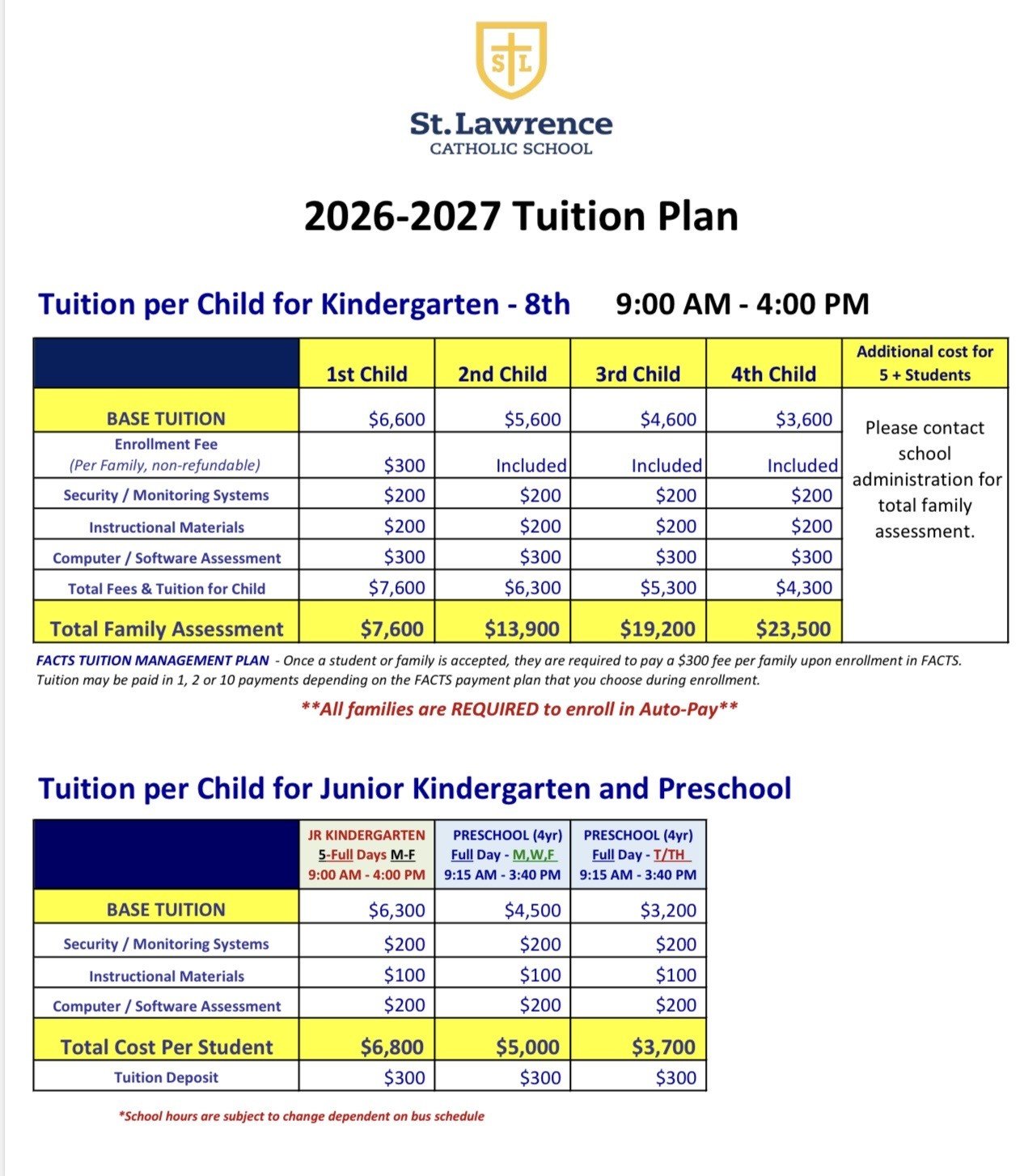 QUESTIONS REGARDING YOUR TUITION ACCOUNT CAN BE DIRECTED TO admissions@stlawrenceparish.com